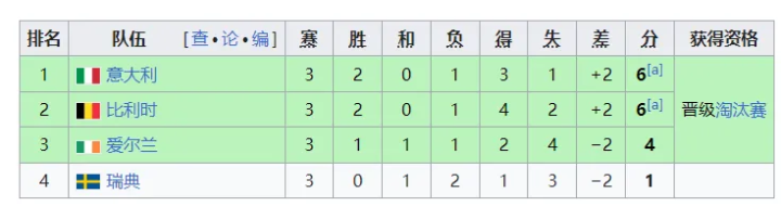 意大利正是凭借着2-0战胜比利时的比赛,意大利积分为3分,比利时为0分,意大利以小组第一出线。比利时以小组第二身份出线。