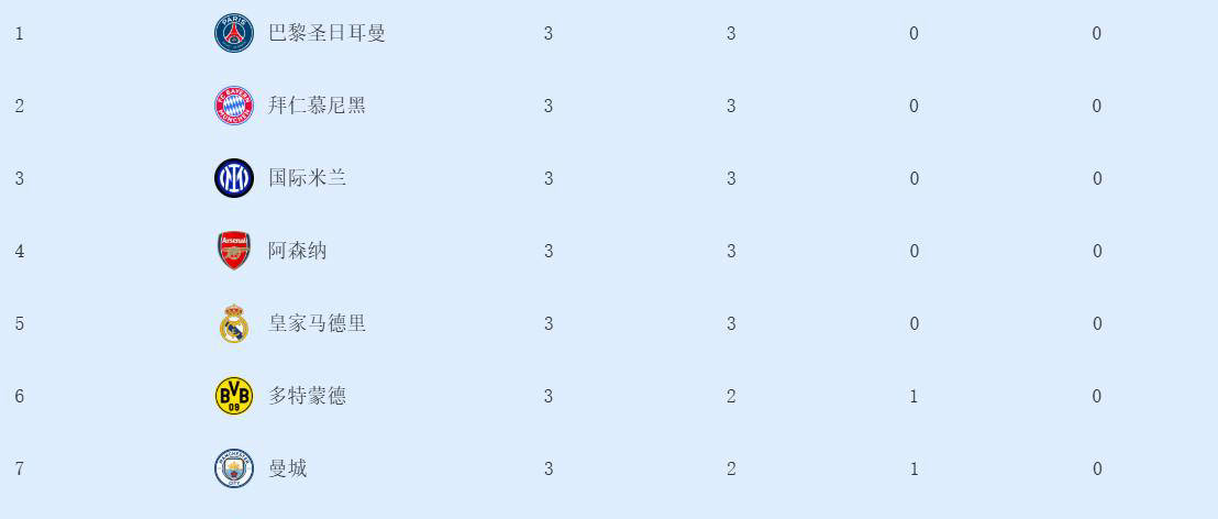 目前,最新的欧冠积分榜显示,有5支球队在3轮比赛中保持全胜,位列积分榜前五名。有趣的是,这五支全胜的球队来自欧洲五个顶级联赛,分别是法甲的巴黎圣日耳曼、德甲的拜仁慕尼黑、意甲的国际米兰、英超的阿森纳以及西甲的皇家马德里。
