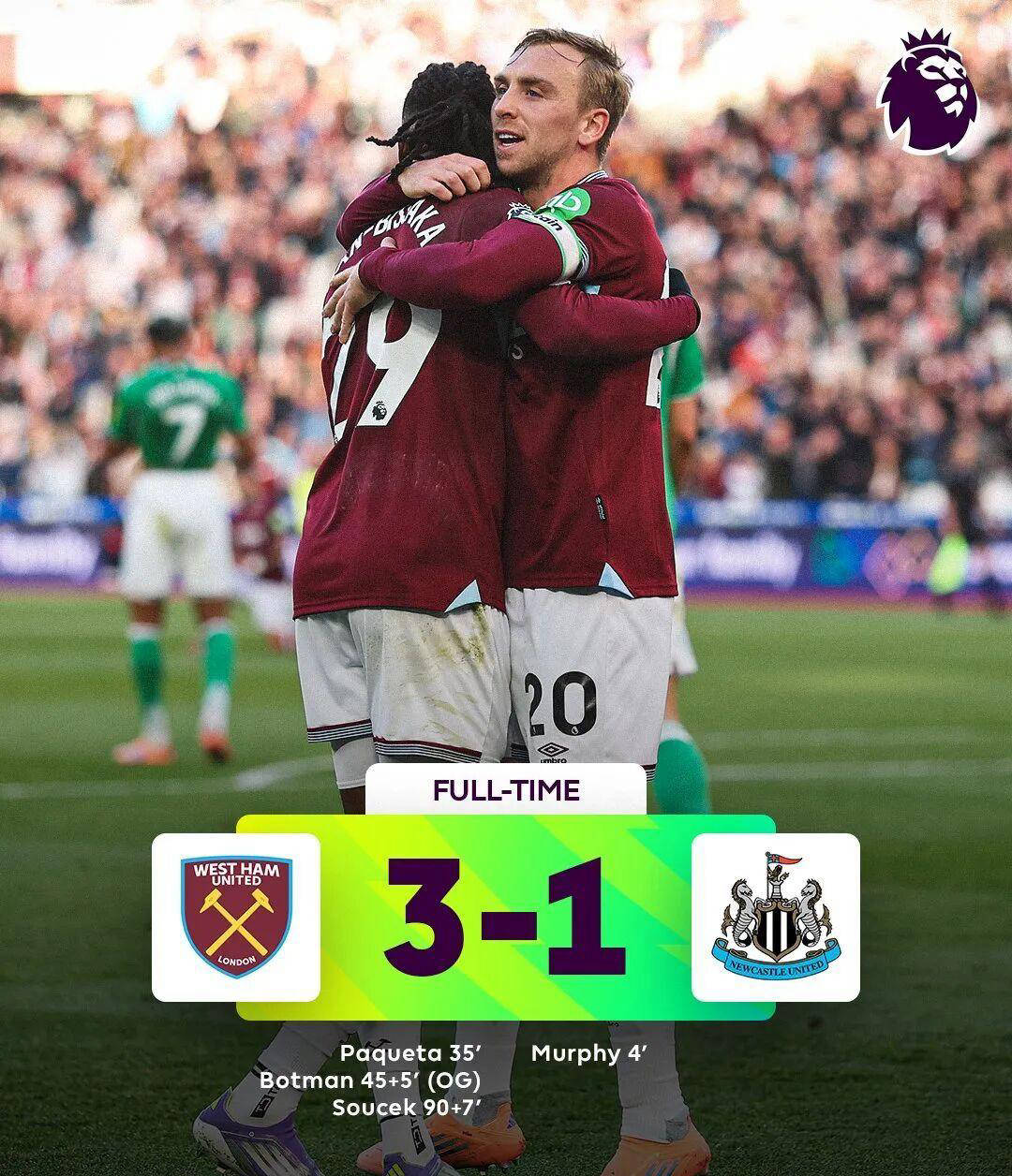 西汉姆联在英超第10轮比赛中以3-1逆转击败纽卡斯尔。帕奎塔和绍切克的进球为球队赢得了宝贵的3分。
