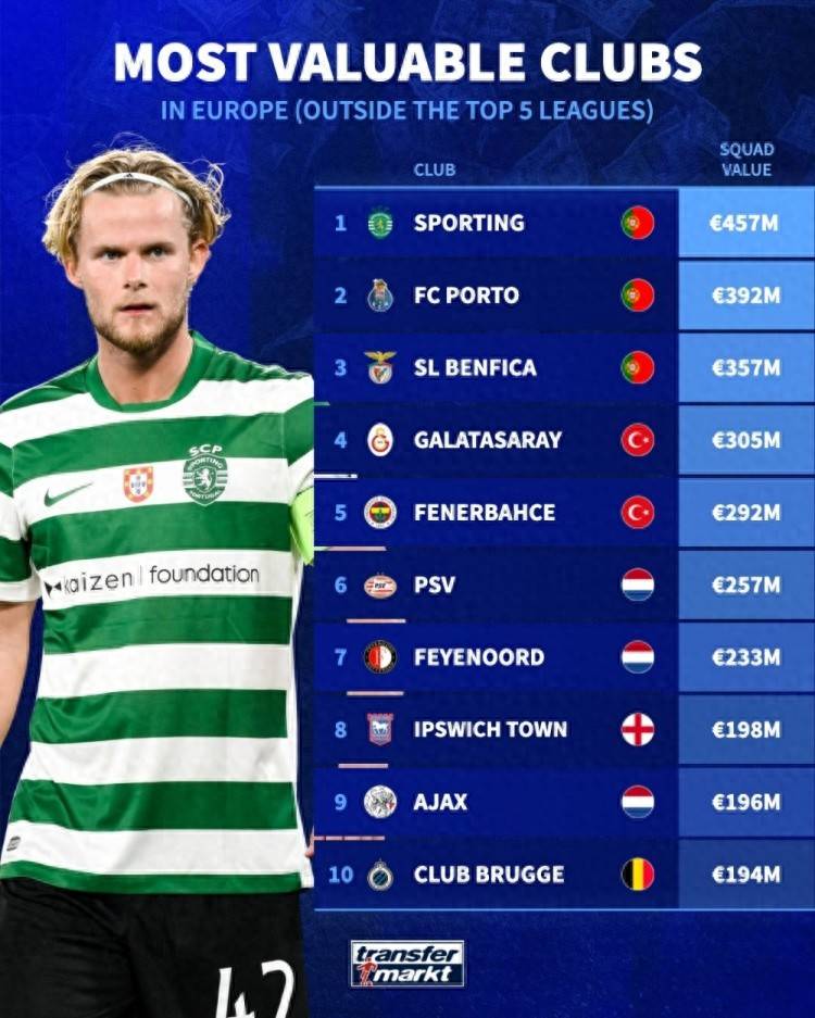 五大联赛,五大联赛直播,英超直播,西甲赛程,意甲比分,德甲预测,法甲分析/全网最全五大联赛资讯平台,涵盖英超、西甲、德甲、意甲、法甲直播入口、赛程积分、实时比分与专家预测分析,手机电脑均可访问!五大联赛中有7支球队的总身价超过了10亿欧元,是名副其实的“贵”球队,英超有4队,分别是阿森纳、曼城、利物浦和切尔西;西甲有2队,分别是皇马和巴萨;法甲有1队是巴黎;德甲和意甲没有总身价超过10亿欧元的球队。那么问题来了,五大联赛之外哪些球队的总身价最高?