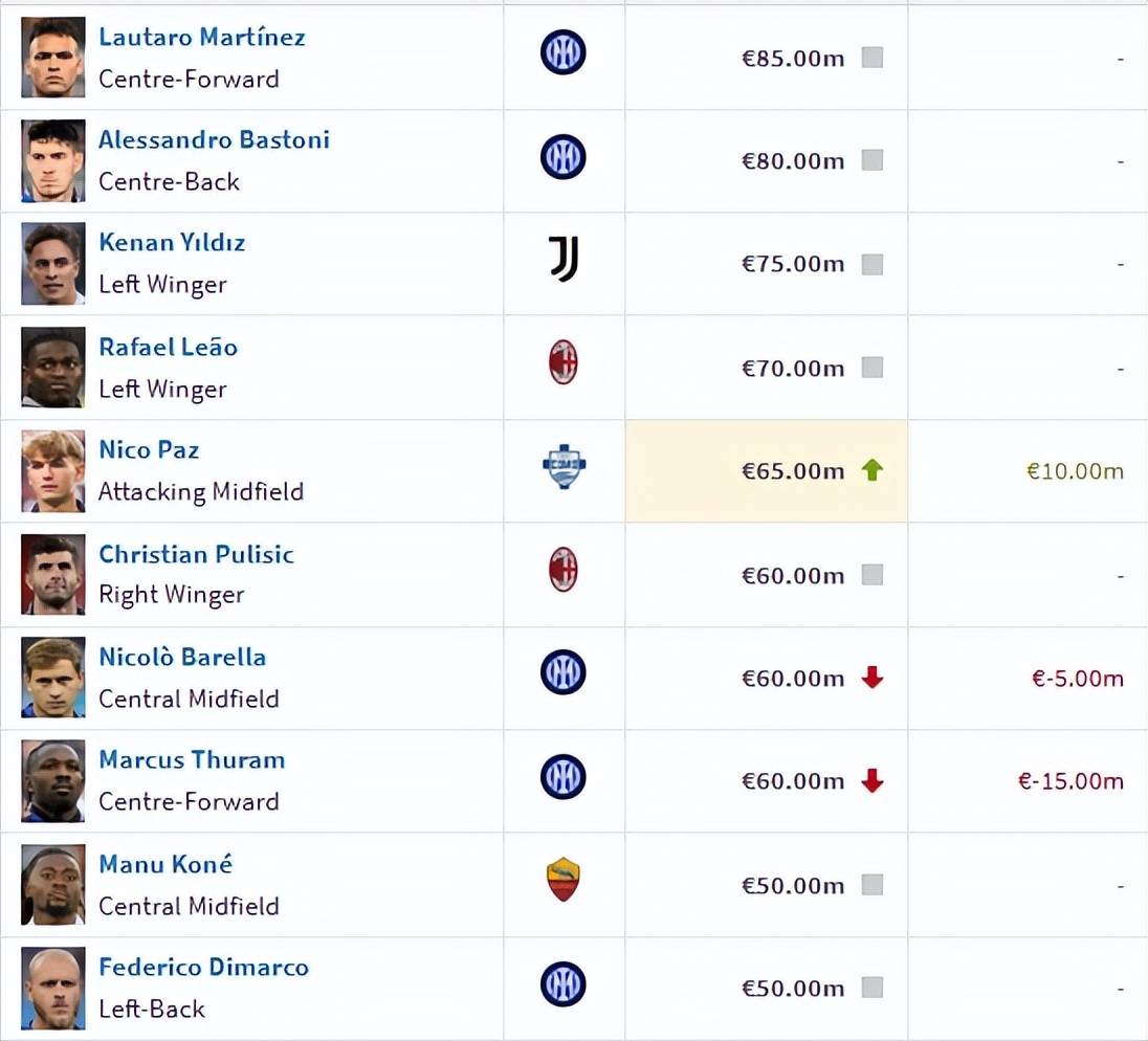 五大联赛,五大联赛直播,英超直播,西甲赛程,意甲比分,德甲预测,法甲分析/全网最全五大联赛资讯平台,涵盖英超、西甲、德甲、意甲、法甲直播入口、赛程积分、实时比分与专家预测分析,手机电脑均可访问!意甲如今就是五大联赛的尾巴,德转12月23日更新了意甲球员的身价,其中国际米兰前锋劳塔罗依然排名第一,而科莫新星帕斯暴涨1000万欧元排名第五。意甲也是五大联赛中唯一一家没有球员身价达到1亿欧元(亿欧先生)的联赛,确实有点掉面。