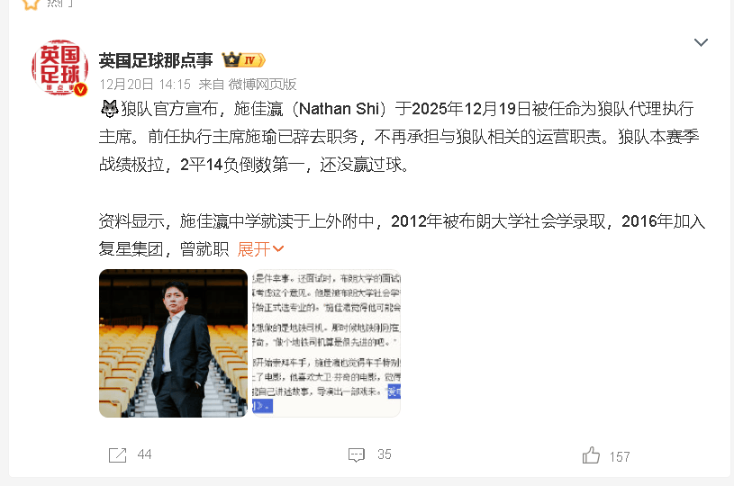 五大联赛,五大联赛直播,英超直播,西甲赛程,意甲比分,德甲预测,法甲分析/全网最全五大联赛资讯平台,涵盖英超、西甲、德甲、意甲、法甲直播入口、赛程积分、实时比分与专家预测分析,手机电脑均可访问!最近英超赛场炸锅了!狼队官方突然宣布:28岁的中国富二代施佳瀛,将于2025年12月底空降成为代理执行主席!而此刻的狼队正以2平14负的战绩稳坐副班长,16轮未尝胜绩,保级形势比曼联的防线还脆弱。这波操作,是绝地求生的孤注一掷,还是资本游戏的荒诞闹剧?中国留洋有好戏吗?