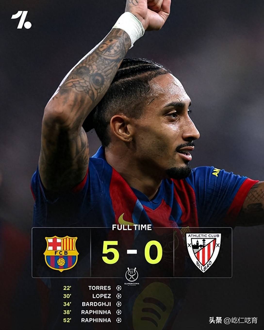 在率先进行的这场西超杯半决赛的较量中,巴萨无疑也延续了球队此前的8连胜和连续4场零封对手的良好发挥--凭借费兰-托雷斯,费尔明-洛佩斯、巴尔德吉和拉菲尼亚在上半场第22-38分钟之内的17分钟连下四城,巴萨几乎不到40分钟就已然终结了比赛悬念。