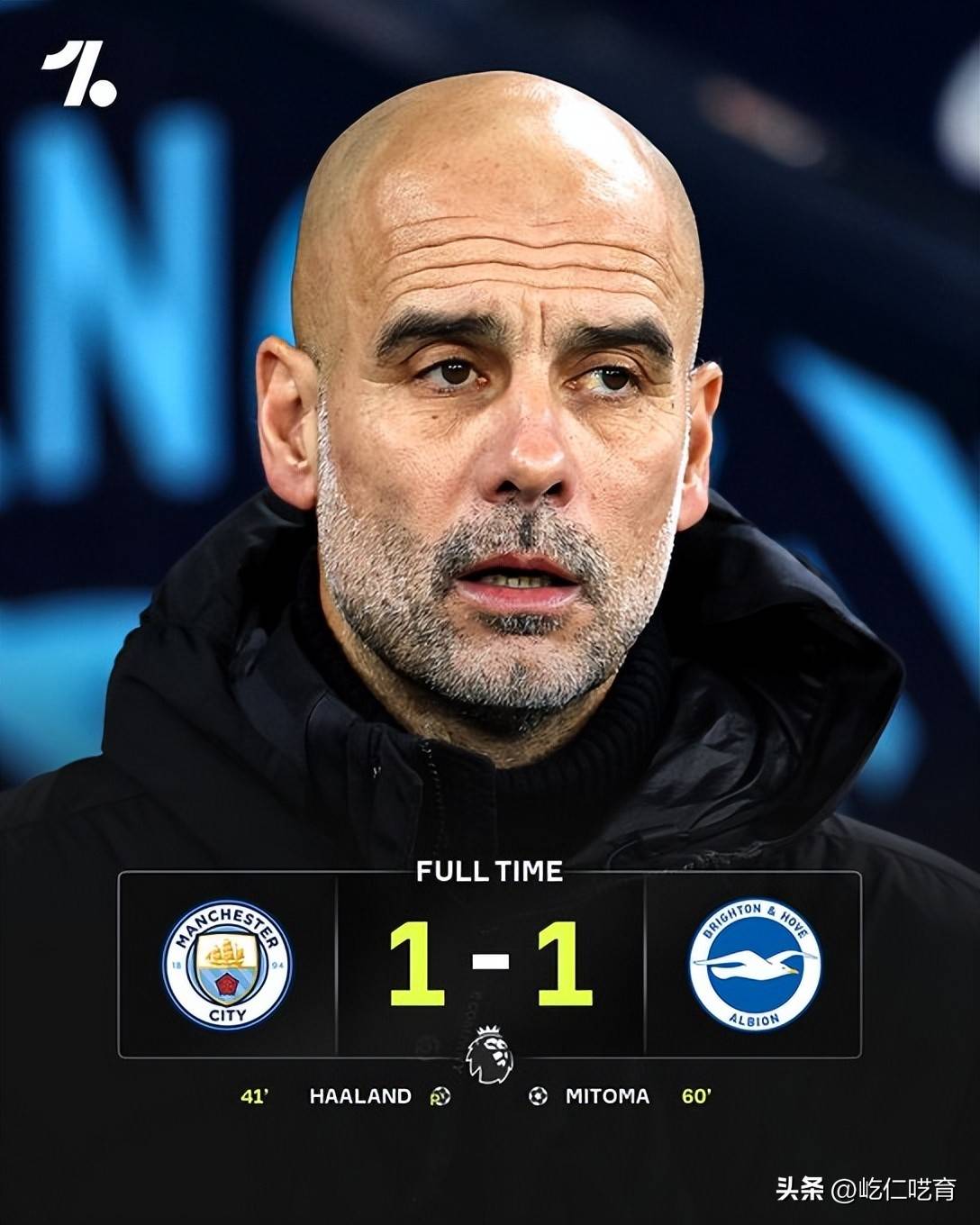 尽管上半场第41分钟哈兰德的点球命中帮助曼城在主场率先取得领先,但迟迟未能打进第二粒进球的蓝月亮,最终在下半场第60分钟由三笘薫帮助布莱顿扳平比分的同时,也让1-1的比分最终保持到了终场结束。