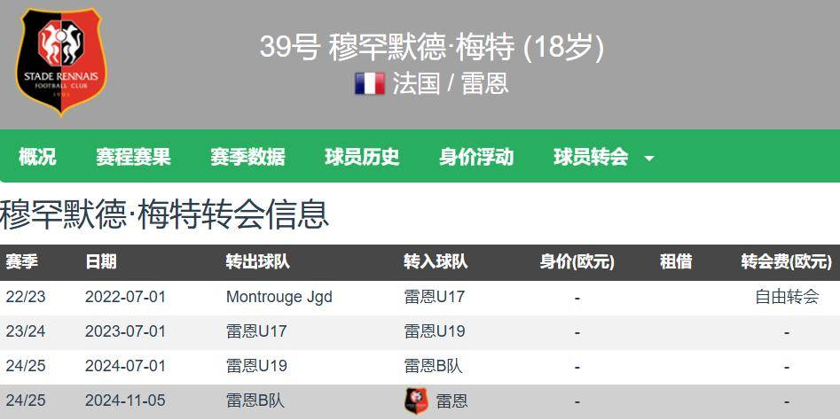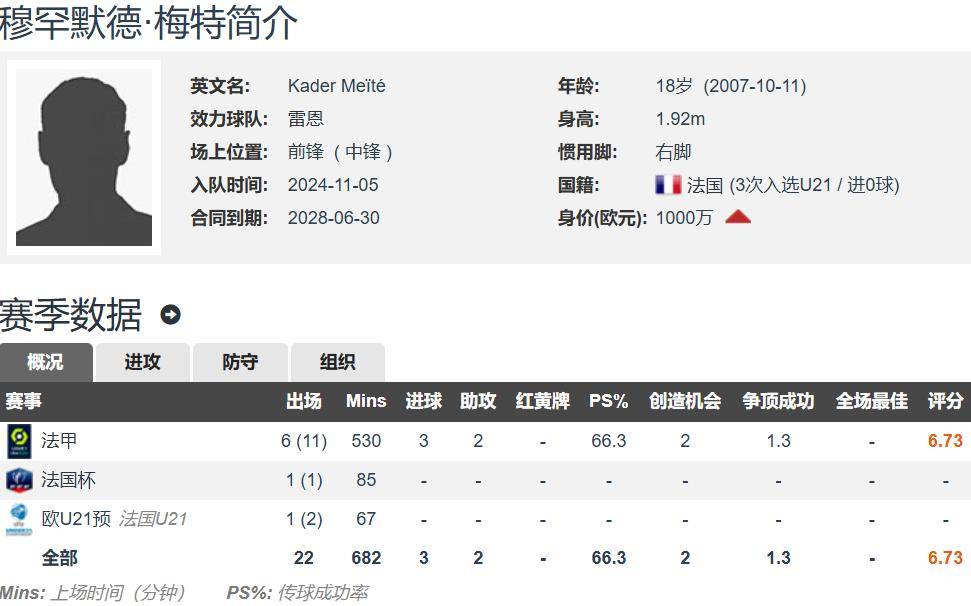 梅特现年18岁,最能涨球的年纪就去沙特淘金了,身高1.82米,右脚中锋,德转估价1000万欧元。梅特本赛季至今各项赛事共为雷恩出场19次,其中7次首发,合计出场615分钟,打入了3球,还有2次助攻,参与进球的效率还是相当不错的。
