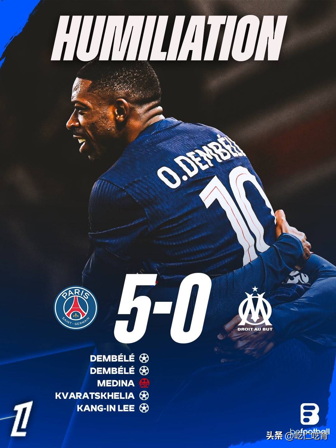 在这样一场法国国家德比的较量中,卫冕冠军巴黎却以令人难以想象的结果取得了本场比赛的最终胜利--从上半场第12和第37分钟登贝莱的梅开二度,到下半场第64分钟马赛球员梅迪纳的自摆乌龙送出的第三粒失球,外加第66分钟k77和第74分钟李刚仁的进球,不到70分钟就已经取得了4-0领先的巴黎,最终也凭借上下两个半场的完美发挥,以5-0的比分大胜马赛的同时而重新回到了积分榜榜首的名次。