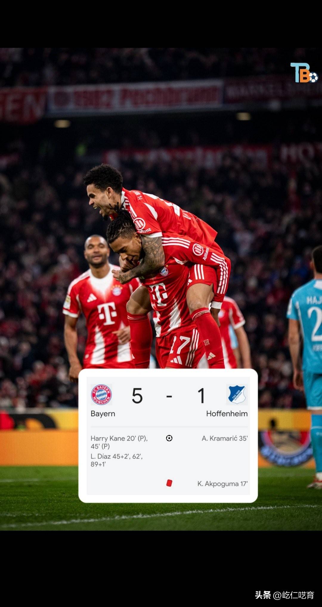 而到了下半场的第62和89分钟,再度打进两球的路易斯-迪亚斯,不仅在本场完成了帽子戏法,更是凭借两度造点的独造5球的表现,率领拜仁在主场以5-1的比分大胜联赛第三的霍芬海姆而终结了球队连续两场不胜的低迷发挥。