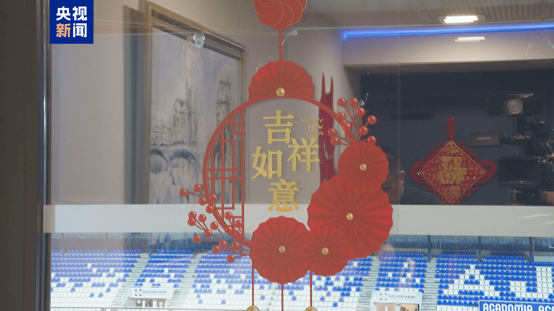 比赛当天,欧塞尔足球俱乐部内的春节符号也十分醒目。窗户上张贴着春联和窗花,球员休息区点缀着红灯笼和马年主题装饰,与赛场大屏播放的春晚宣传片相呼应,烘托着浓浓的节日氛围。